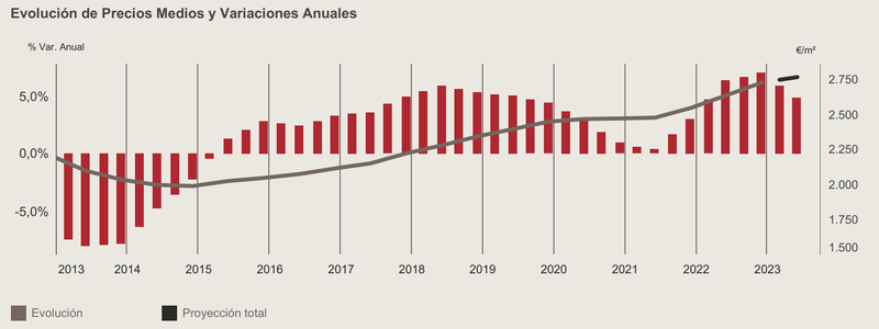 El Informe de Tendencias del Sector Inmobiliario (Vivienda Nueva) que elabora Sociedad de Tasación concluye que el precio medio de la Vivienda Nueva ha aumentado un 7,1% durante los últimos doce meses hasta alcanzar los 2.732 €/m2 en diciembre de 2022, acelerando así su ritmo de crecimiento. Durante el segundo semestre del año, el precio también se ha mantenido al alza, con una variación semestral positiva del 3,4%. Aunque el precio de la vivienda nueva continúa al alza, el dato registrado a cierre de 2022 se sitúa lejos del máximo alcanzado en 2007, cuando la vivienda nueva alcanzó prácticamente un precio medio de 3.000 €/m2.