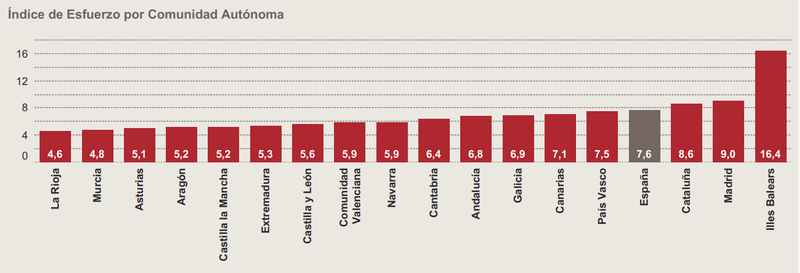 Por comunidades autónomas, Comunidad Valenciana, la Región de Murcia y País Vasco registran los mayores incrementos de esfuerzo trimestral, superiores al 4%. Por otra parte, en seis comunidades el índice se mantiene invariable, y La Rioja es la única autonomía que registra un descenso del 2,1%.