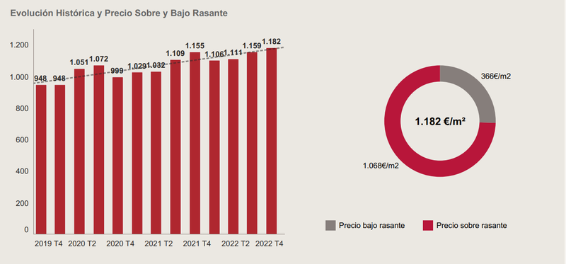 El coste de construcción de obra nueva ha alcanzado los 1.182 €/m2 en diciembre de 2022, tras registrar un aumento del 2,3% con respecto a hace un año. Durante los últimos seis meses, su evolución también ha sido alcista, con un crecimiento del 2% entre septiembre y diciembre de 2022. La ratio de construcción sobre rasante se ha situado en 1.068 €/m2, mientras que la de bajo rasante alcanza los 366 €/m2.