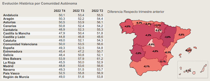 Todas las comunidades autónomas registran descensos en el Índice de Confianza, tanto semestralmente como anualmente. Estos descensos varían entre los 14 puntos semestrales de la Comunidad de Madrid y La Rioja, hasta los 6 puntos registrados en Canarias. Del total de autonomías, únicamente 7 de ellas registran un Índice de Confianza que permanece en la zona optimista. Las Islas Baleares es la comunidad con mejor valoración, con 53,9 puntos sobre 100. En el lado contrario de la tabla se encuentra Castilla y León, con el índice más bajo de todo el territorio nacional (44,8 puntos).