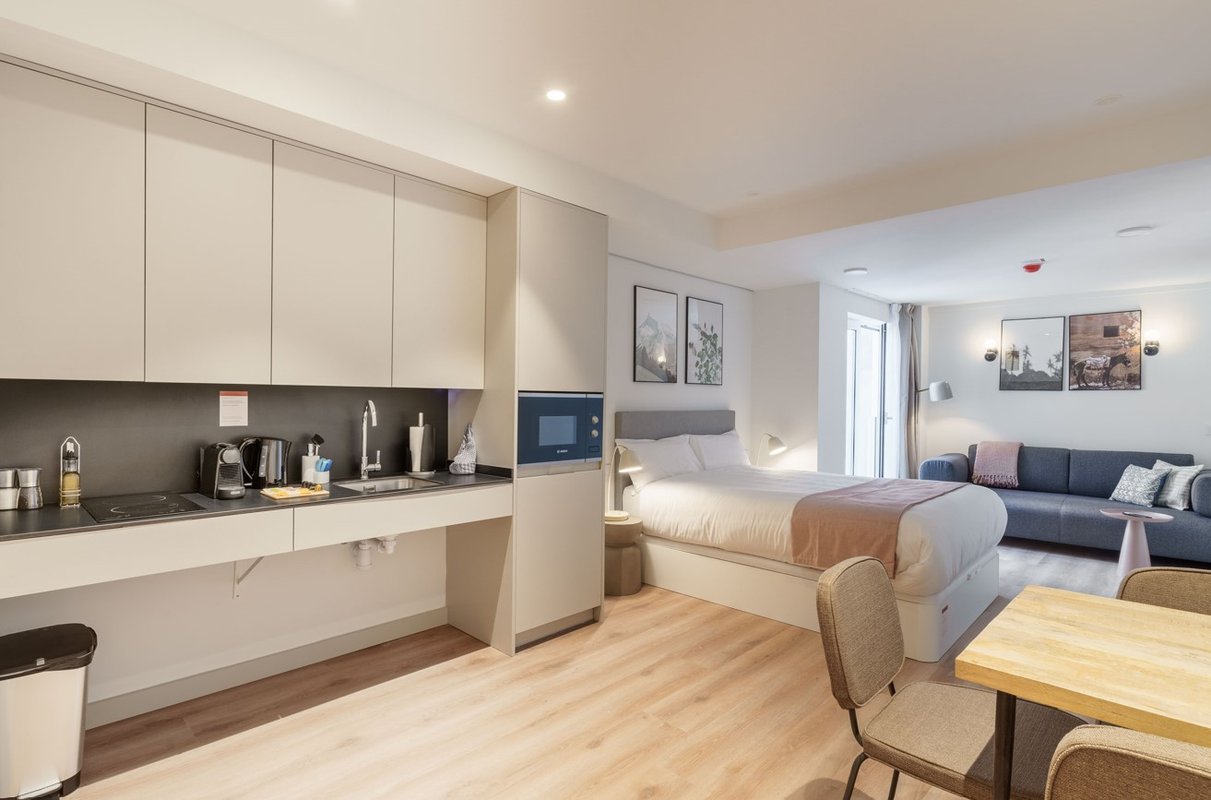 El edificio, anteriormente destinado a oficinas, ha sido completamente reconvertido por Redentum Partners en un moderno complejo de 41 estudios equipados para estancias de corta y media duración. Cada unidad cuenta con cocina integrada y servicios tecnológicos, a pocos minutos del Estadio Santiago Bernabéu y la zona financiera de la ciudad. Este proyecto, cuya apertura tuvo lugar en noviembre de 2024, responde a la creciente demanda de alojamiento flexible en Madrid.