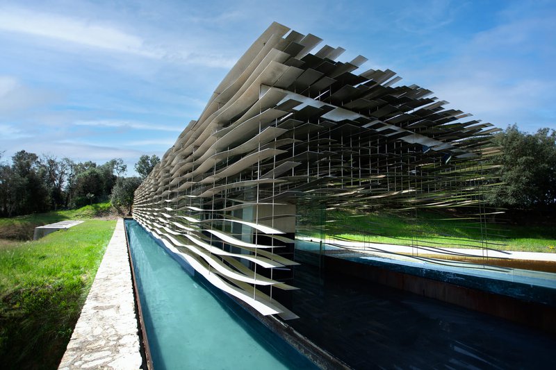 El Pabellón en el Estanque fue diseñado por el estudio arquitectónico RCR, ganador del Premio Pritzker en 2017. El concepto arquitectónico del Pabellón se centra en la conexión con la naturaleza y la creación de espacios amplios y luminosos. El uso del vidrio y el acero permite la entrada de luz natural en los interiores y crea una sensación de conexión con el exterior. Se trata de un diseño minimalista que simula el oleaje del mar. Está destinado a ser un espacio de ocio y cuenta con barbacoa, piscina, zonas de reunión y cinco habitaciones.